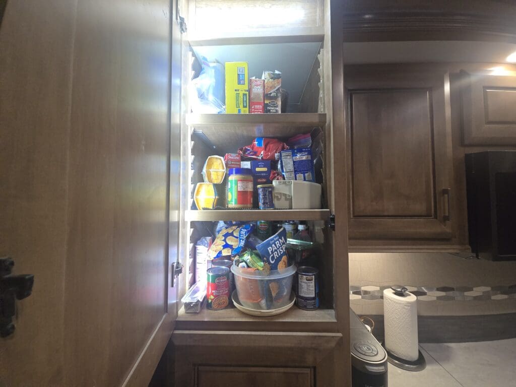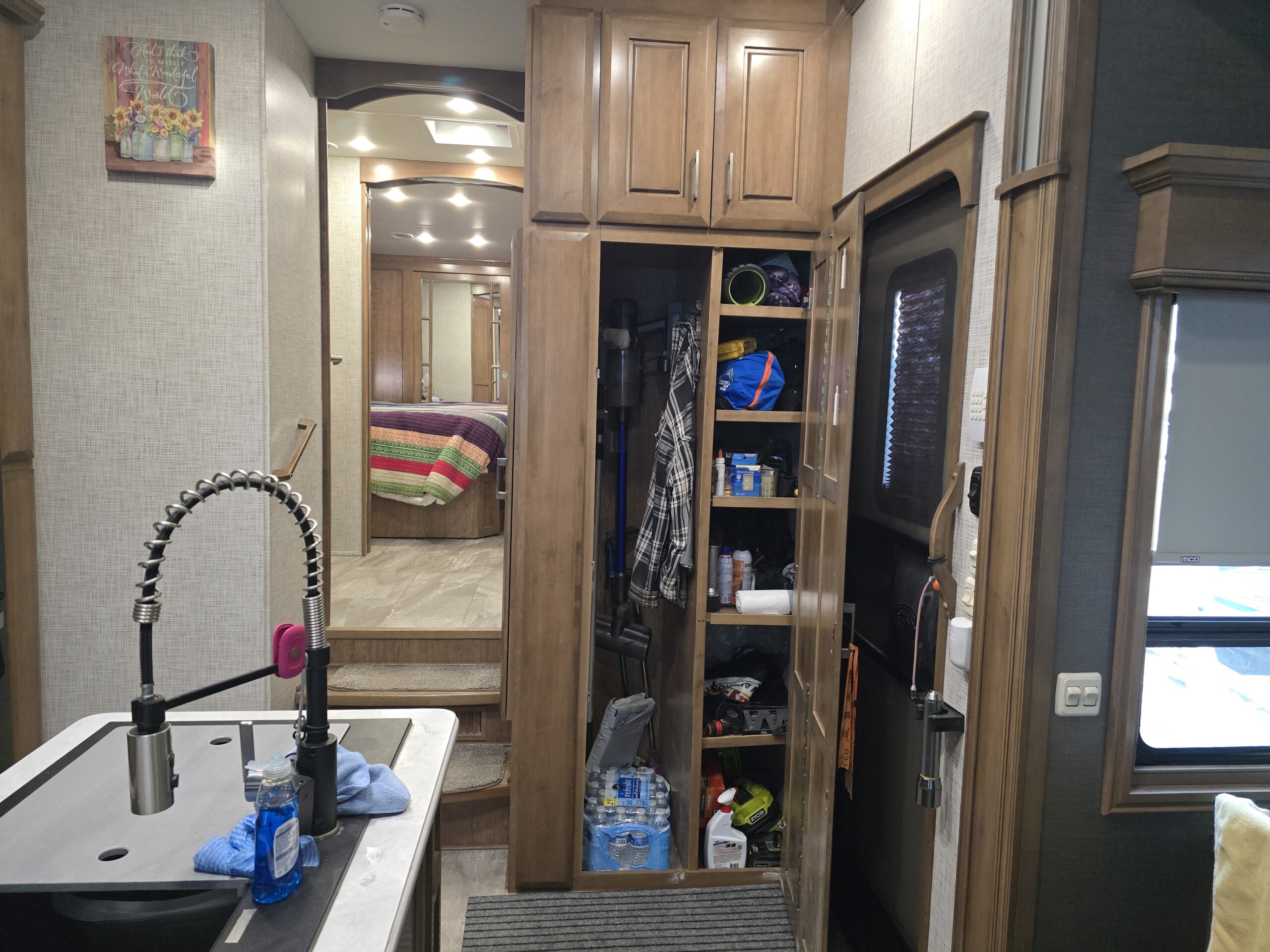 - Washer/Dryer Closet Conversion: Split full height into two sections — right side with five floor-to-ceiling adjustable shelves; left side open with plumbing and 110V outlet retained for washer/dryer